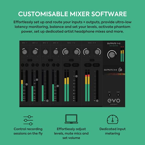| audient EVO8 | 楽曲制作向け | 24bit/94kHz | スマートゲイン機能 ループバック機能 ハイパフォーマンスAD/DAコンバーター |