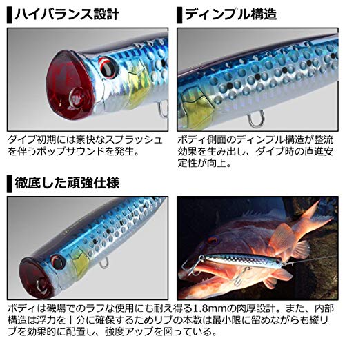 ヒラマサやキハダマグロなどの大型青物に対応可能なポッパーで、スリムボディが特徴です。
