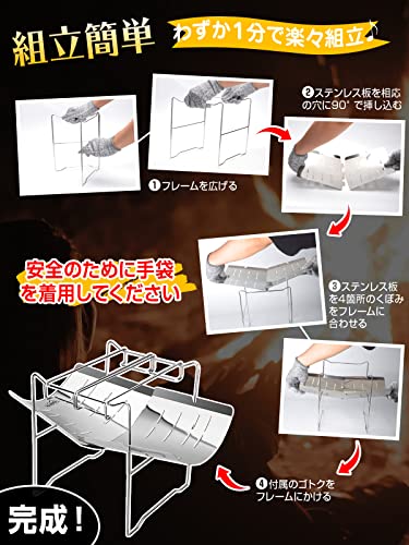 フレームにステンレスの板を載せるだけで、簡単に組み立てができるコンパクトな焚き火台です。