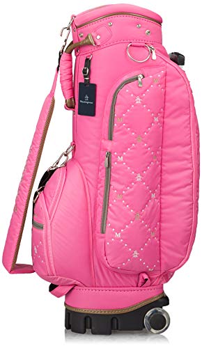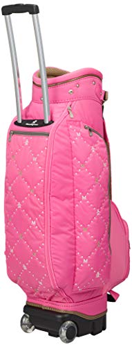 ピンクの色合いが鮮やかな、かわいらしい2輪タイプのキャディバッグで、ポケットに施された白いロゴ刺繍が特徴です。