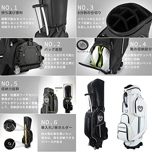 伸縮キャリーバーが付いた2輪タイプとなっており、6分割口径でクラブの分類もしっかりできます。