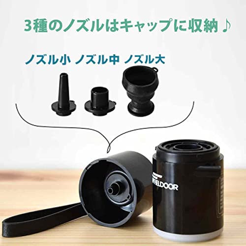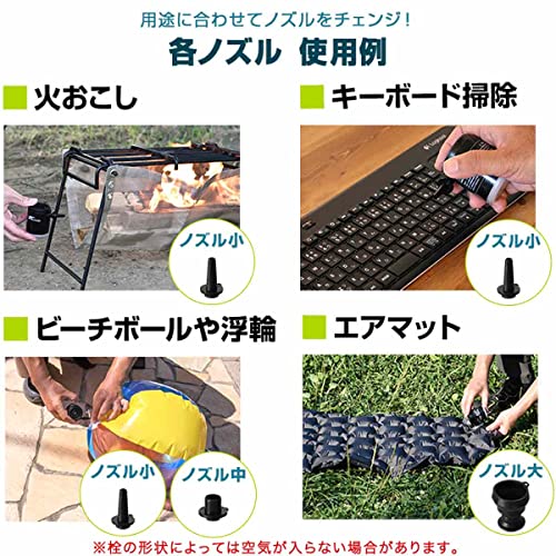 エアーマットのみならず、浮き輪やボムボートまで幅広い大きさのノズルが同梱されているので、キャンプ以外にも多くのアウトドアレジャーに活用出来そうです。