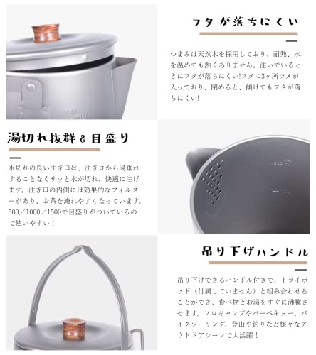バーベキューや焚き火での使用に適したダブルハンドル仕様のチタン製ケトルで、目盛りも付いているので機能性も考えられています。
