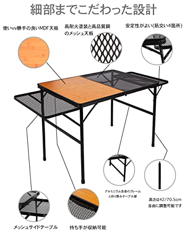 さらに、両サイドにメッシュのサイドテーブルがあるため必要に応じて幅を変えることができ、大人数だけでなくデュオや少人数でのキャンプにもいいかもしれません。