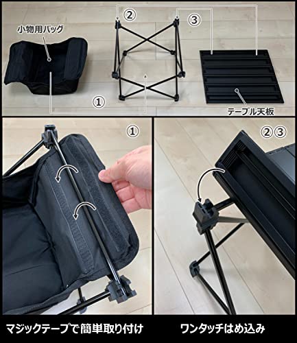 ブラックを基調としたクールなキャンプ用テーブルで、テーブル下に深めの収納袋を備えており、多くの荷物を収納可能です。