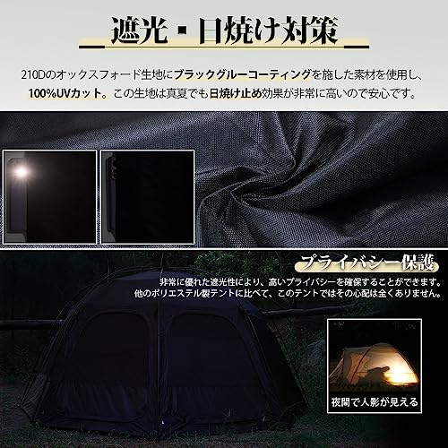 高さが2mあり、室内空間は十分な広さがあるので圧迫感を感じることなく、様々なレイアウトを楽しめるドームテントです。
