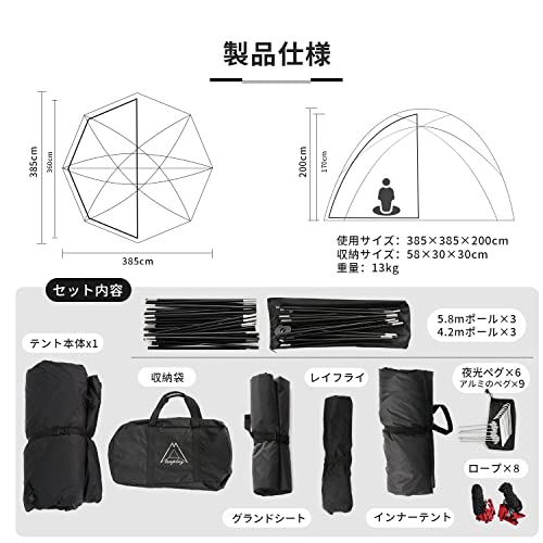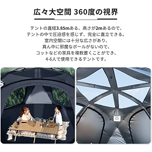 直径が3.85m、高さが2mあるので、テント内で圧迫感を感じることがなく、様々なレイアウトが楽しめます。