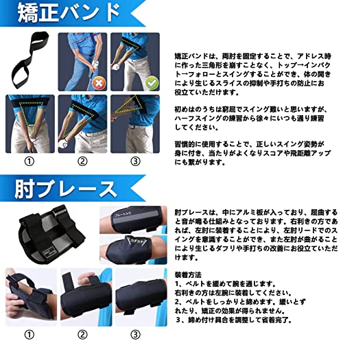 矯正バンドは構えた際のアークを崩さずスイング、肘ブレースは左腕主導のスイングを意識できます。