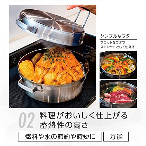 オールステンレス素材のダッチオーブンで持ち手ハンドルがなく、リフターを使用して鍋や皿として使用することができます。