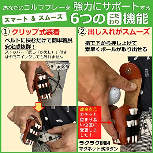 留め具はボタン式となり、ボール2個以外にもティーを収納できるので、ラウンド中にもスムーズに小物を取り出せるでしょう。