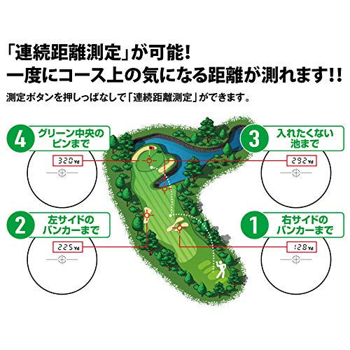 計測ボタンを押しっぱなしで連続距離測定が可能となり、バンカーや池、グリーンまでの距離を1度で把握することができます。