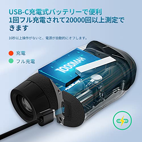 950mAhのバッテリーを内蔵しており、20秒間操作がないと自動でオフになり、フル充電で20,000回の測定が可能です。