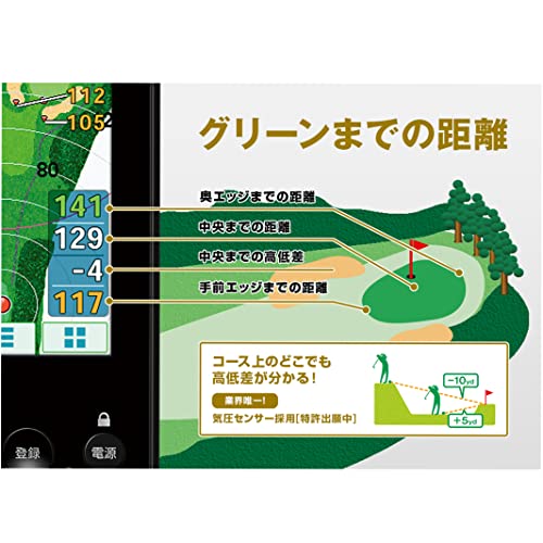 大きなモノクロ表示と、ボタン1つでグリーンまでの距離や高低差もわかるので、幅広い年代が使いやすい画面となっています。