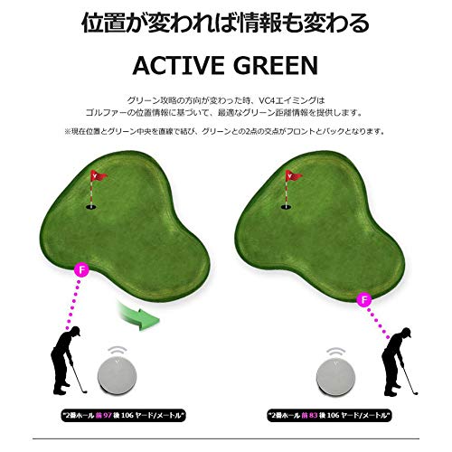 音声と画面表示の両方で、コース内の各ホールの距離やグリーンの位置を表示することができます。