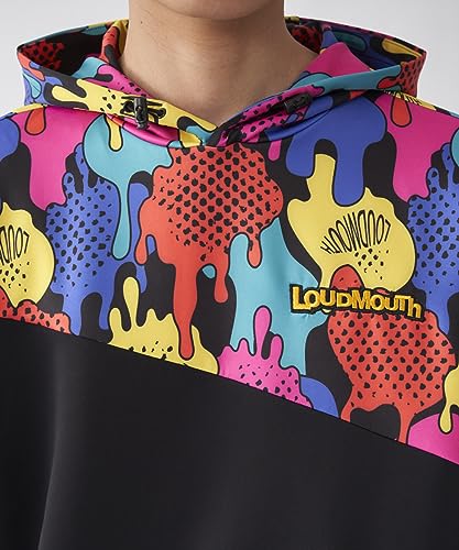 胸元からフードにかけて、インクのようなカラフルなオリジナル柄が施された、カジュアルなパーカーです。
