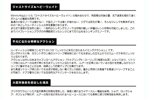 95mmの全長に40gのウエイトを持ち、陸っぱりからオフショアまで幅広く活躍するヘビーシンキングモデルです。