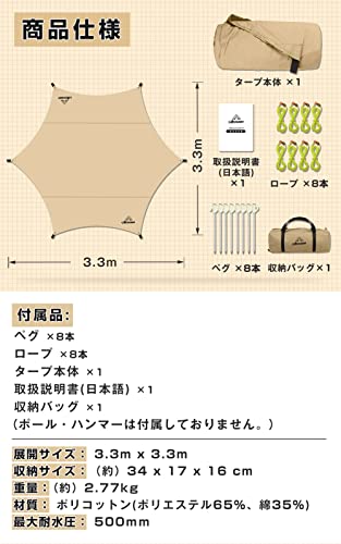 AKASOOM ヘキサタープ TCポリコットン TC-khaki-3.3mx3.3m-GMポリコットン500mm