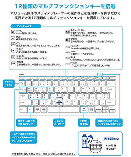 | Ewin コンパクトワイヤレスキーボード | 平面 | 29.5×12.2×2cm/290g | 無 | 日本語 |