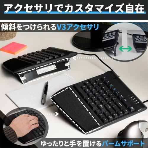 V字型のキー配列により肩と手が適度に開き、長時間タイピングをしても肩や手首が疲れにくい設計となっています。