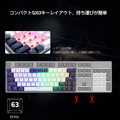 全63キーコンパクトサイズに仕上げており、限られた環境下で使用しやすく、マウス可動域を広く確保できるキーボードです。