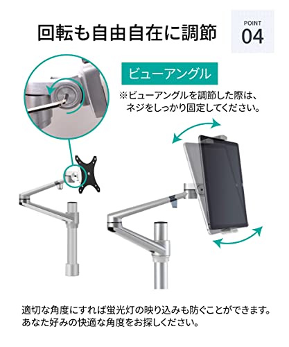アーム部分の高さが簡単に調整できるため、座ったり立ったりしながら作業する際にも便利なモニターアームです。