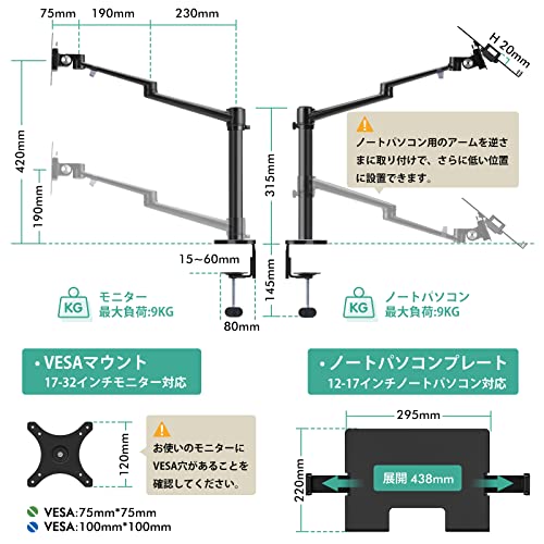 ノートパソコンと一緒に設置できる2in1タイプのモニターアームです。
