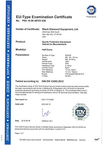 ヘルメットの安全規格はヨーロッパ規格のEN 12492と、国際山岳連盟のUIAA106です。