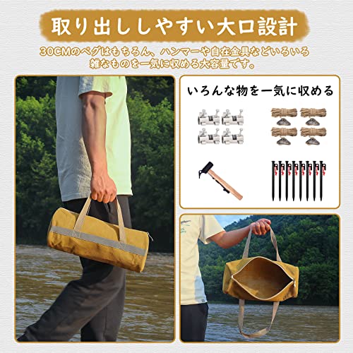 丈夫なため尖ったペグも安心して収納することができ、長く使い込むほど白く折り目やかすれが付いて味のある見た目になる帆布を使用しています。