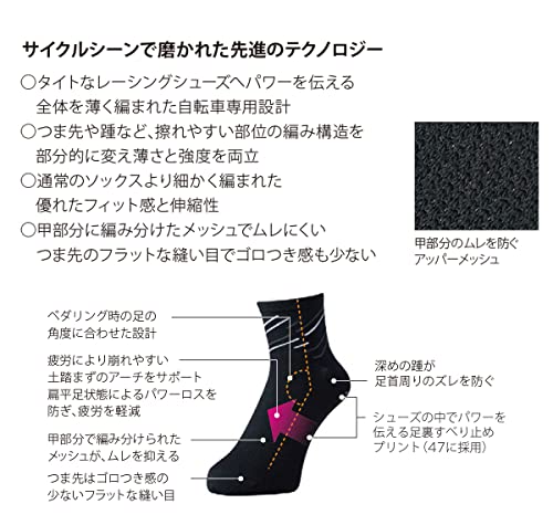 足にフィットするよう超立体製法により作られており、中上級者向けに一歩進んだロードバイク用ソックスをお求めの方におすすめです。