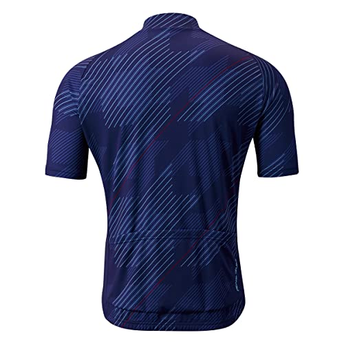 ネイビーブルーとホワイトのラインが爽やかな印象を与える半袖タイプのロードバイク用ウェアです。
