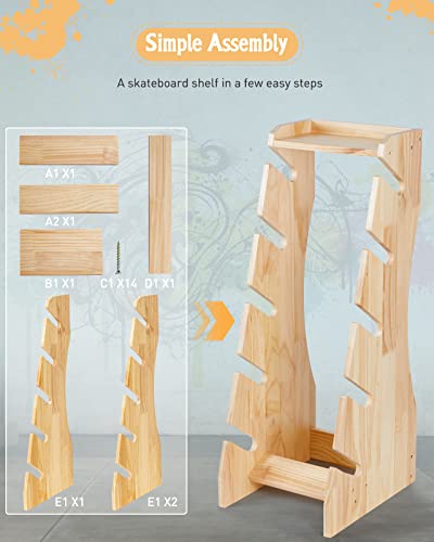 こちらはパイン材を使用した柔らかな雰囲気の自立型デッキスタンドで、スケートボードを最大5枚保管することができます。