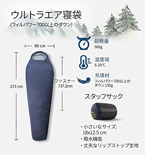 | Litume700フィルパワーダウンのマミー型寝袋 | 500g | 215×80cm | ナイロン、ダウン | 6℃〜20℃ |