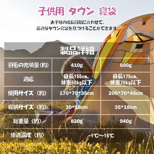 | QEZER 子供用寝袋 マミー型 | ダウン | -15度 |