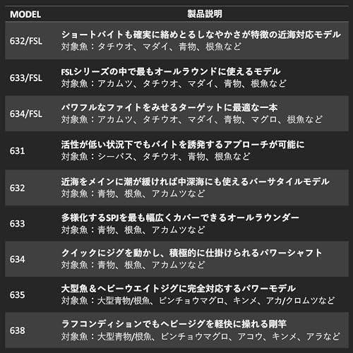 操作性に優れたレングスの汎用タイプとして、青物から根魚、アカムツまで幅広いターゲットに対応します。