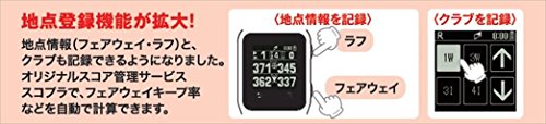 フェアウェイの中心までの距離が分かるフェアウェイナビ機能や2グリーン同時表示、スコアカウンター、飛距離表示など便利な機能を搭載しています。