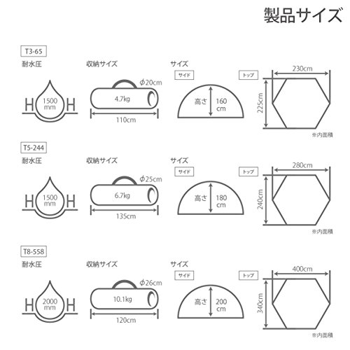 基本的には収容人数に応じて収納サイズも大きくなりますが、フレームの作りによっても収納サイズが変わります。