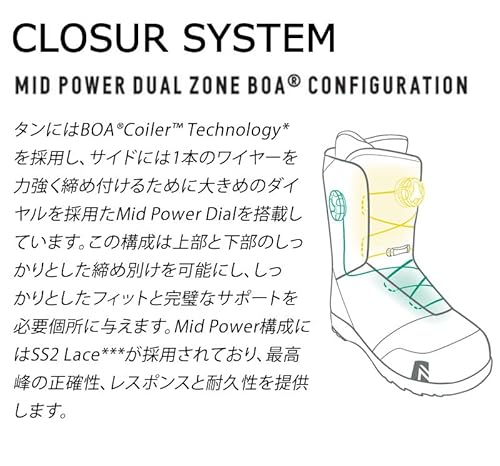こちらは中間ほどの硬さがあり、デュアルBOAフィットシステムを搭載により、簡単な操作で高いフィット感が得られます。