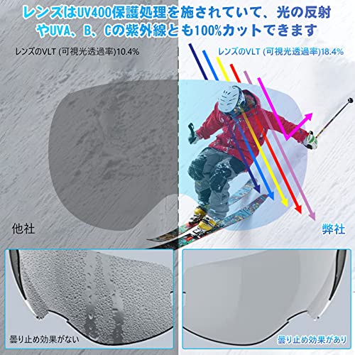 紫外線や雪の強い照り返しを99%カットし、インナーには防曇レンズを使用してクリアな視界を確保します。