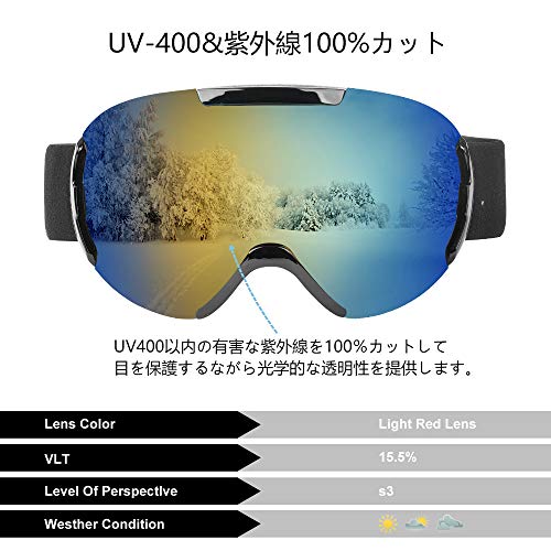こちらは球面レンズで、180度の広視野で100%のUV400保護が可能なゴーグルです。
