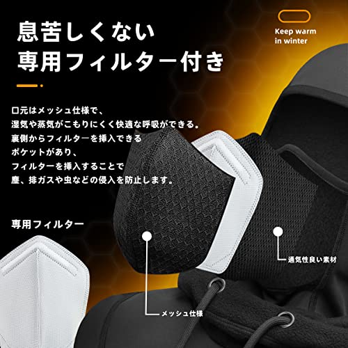 フルフェイスとフードスタイルでは頭を守りながら耳や首元も保温することができ、暖かく厚過ぎない生地を採用しています。