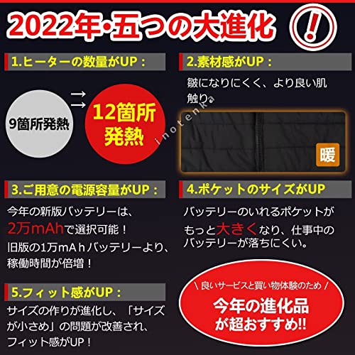 ベストの前と後ろに12箇所のヒーターが備わっており、胸元のスイッチで三段階に温度調整が可能です。