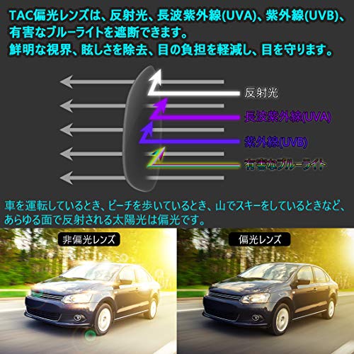 偏光レンズで照り返しなどの乱反射をカットし、UVカット率も99.9%です。