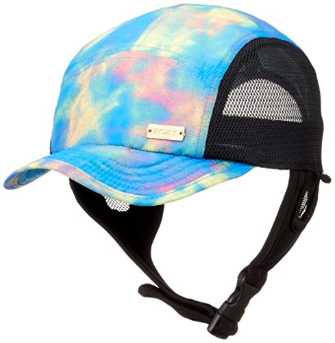 サーフキャップの前にはROXYと書かれた小さなゴールドのプレート、後ろにはレインボーカラーでRoxyと書かれています。