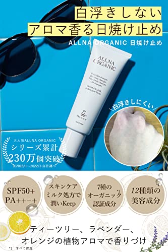 ラベンダー、ティーツリー、オレンジの植物アロマ配合で、アロマ香る日焼け止めとしても人気です。