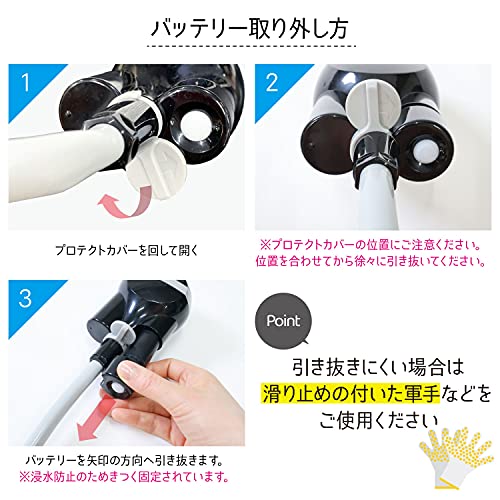 シャワーヘッドにあるスイッチにて、簡単な止水や水量調整が無段階で行えるほか、USB充電式の大容量バッテリーが搭載されています。