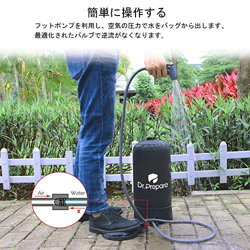 フットポンプで内側に空気を溜め、空気圧で水が出る仕組みの電池不要の簡易シャワーです。