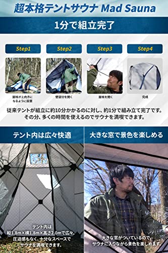 設置1分ととても簡単で、セットのSUNGA専用サウナストーブと併用すれば、燃焼15分で室内が100℃を超える本格的なサウナテントです。