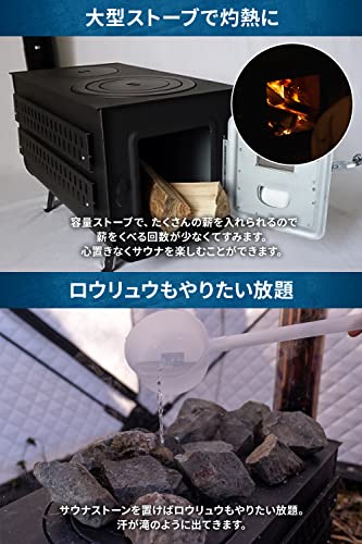 テント内を100℃以上に温めるパワフルな薪ストーブも魅力で、熱に強く破裂しにくい火成岩のサウナストーンも付属しています。