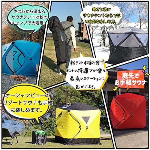 赤や黄色などカラーバリエーションも豊富で、アウトドア環境でも人目を惹く注目のテントサウナです。