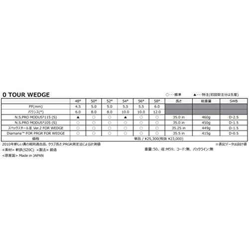 | プロギア 0 TOUR | 11 | 6.5 | ワイドグラインド(トゥ・ヒール) | 412 448 455 448 | Diamana TM FOR PRGR カーボン スペックスチールⅢ Ver.2 スチール N. S.PRO MODUS3 120 (S) スチール N. S.PRO MODUS3 105 (S) スチール |